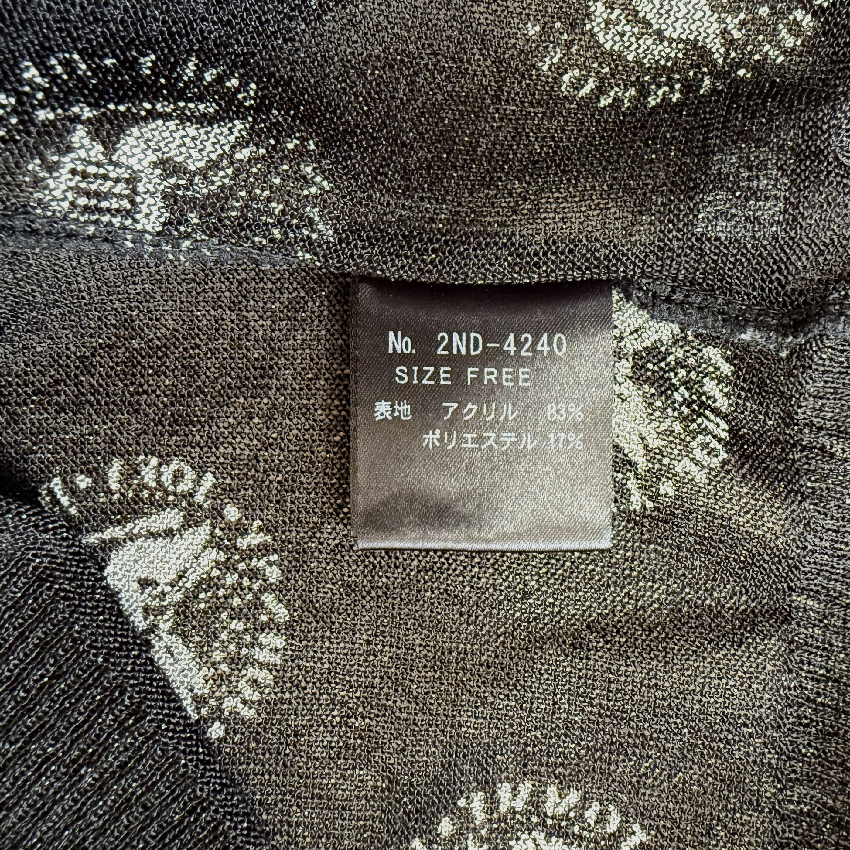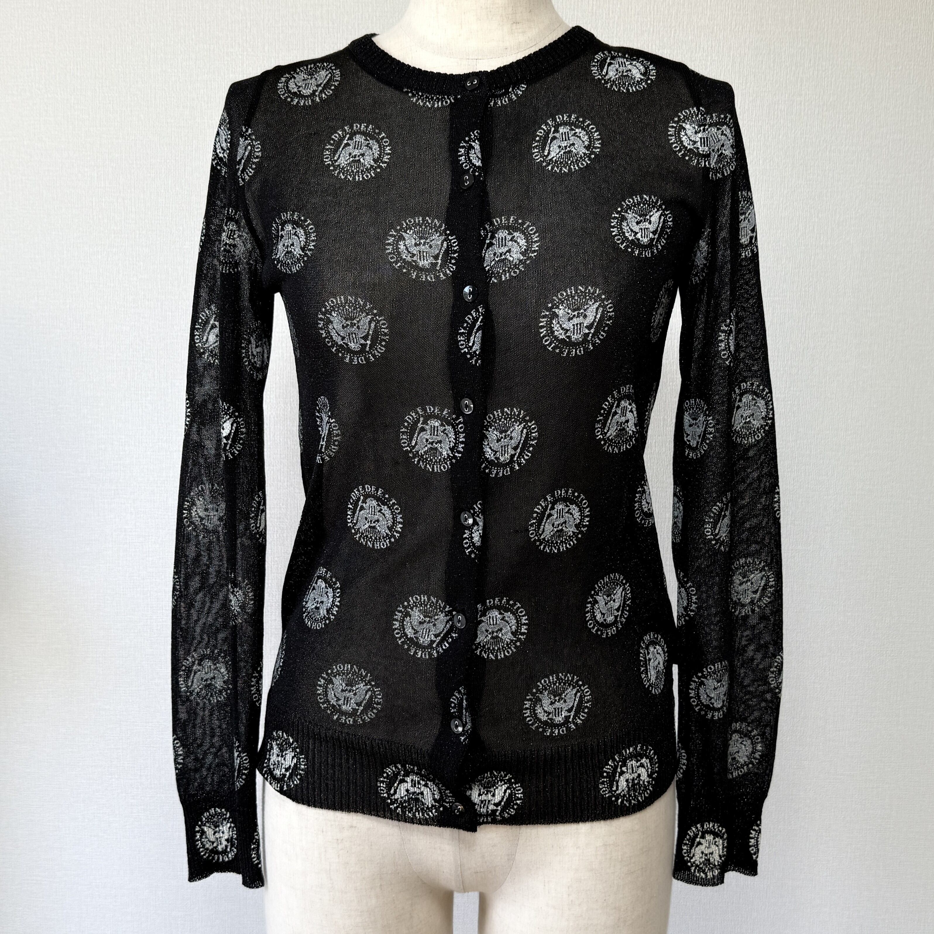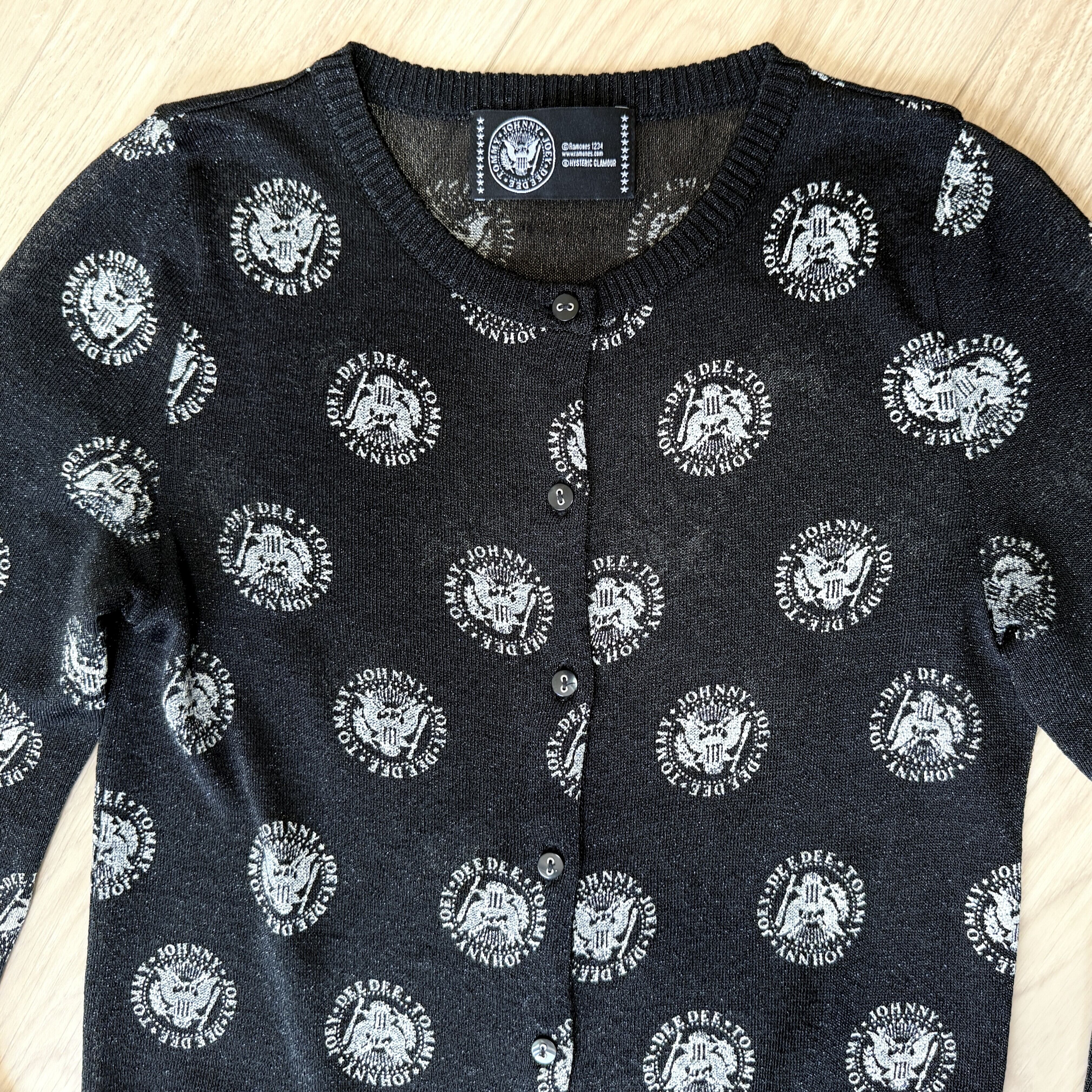 ラメの入った薄手のカーディガンにラモーンズロゴの総柄プリント