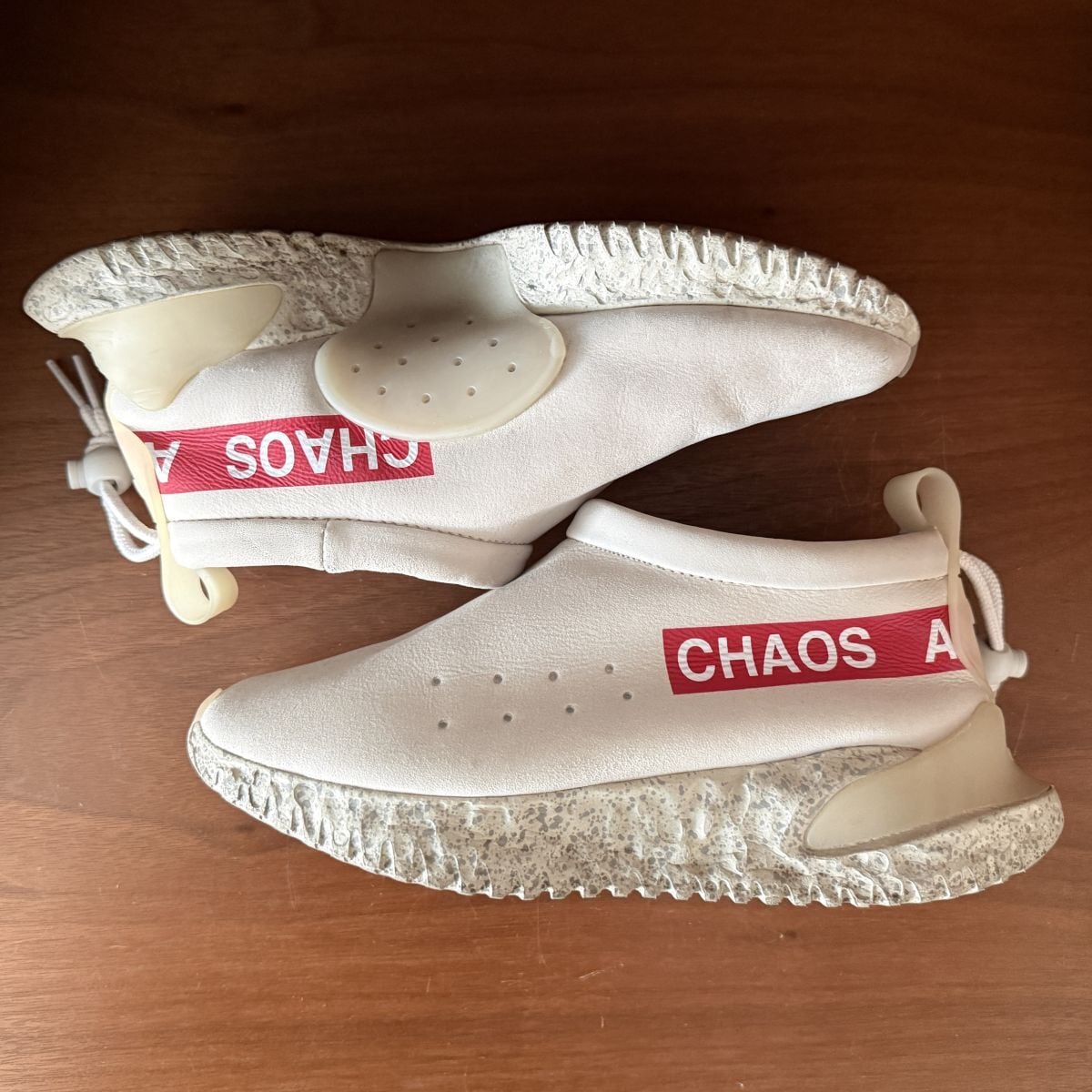 ホワイト地に赤で「CHAOS AND BALANCE」混沌と調和プリント